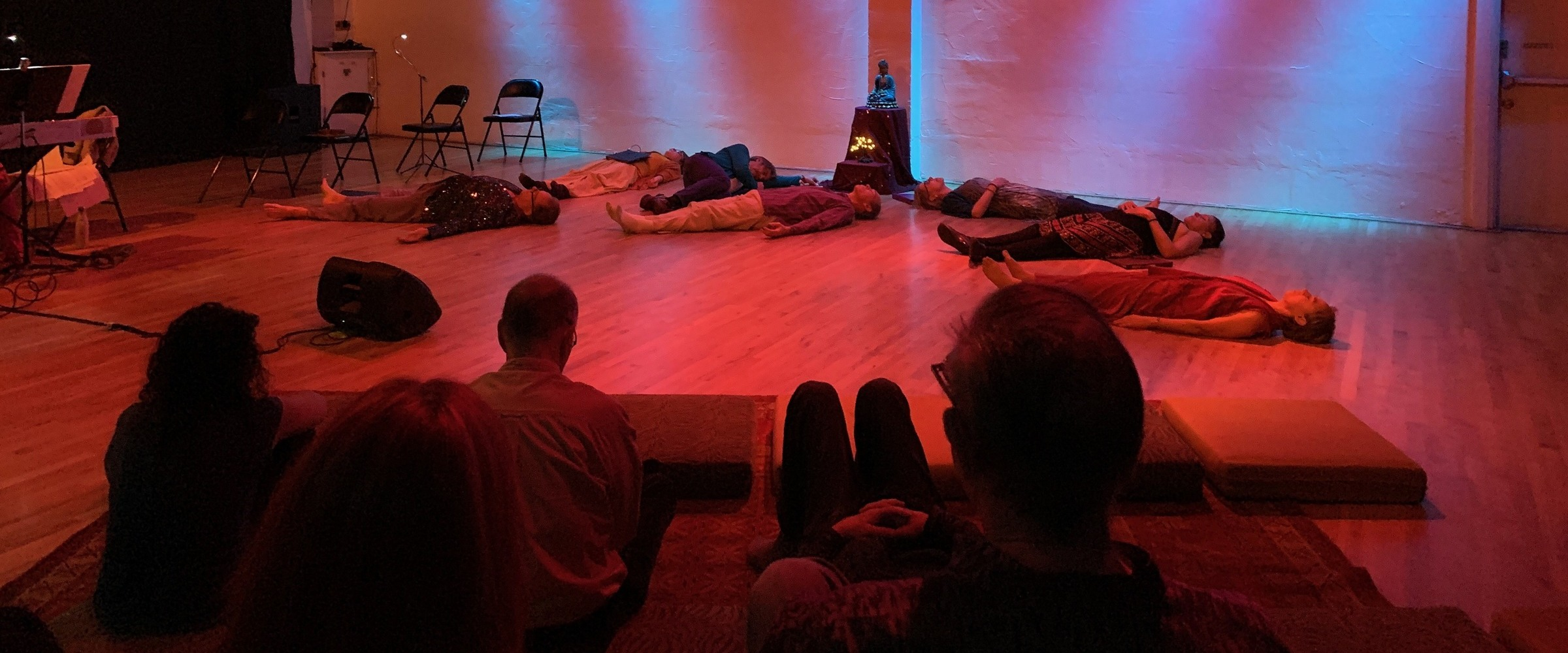 Your ensemble intones everything from silence to spirited vocal expression, portrays stationary body positions to energtic flowing movement. You combine vowel sounds readily recognized, with sounds strange and new like Sanskrit. You challenge your audience to bathe in pure, healing sound–sound for the sake of sound, without word form or contextual meaning–sound to amplify breathing and inner calm and peace and joy.