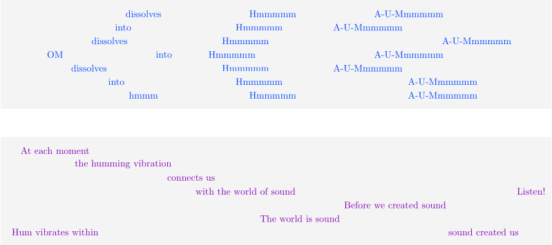 - The texts of the choral poems and musical movements were a mashup of syllables with no literal meaning, as well as instructions to the audience on where to place their attention at a given moment. The following two lines of choral poetry are part of larger choral poem that precede and provide a mental preparation for a musical performance featuring humming: